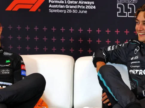 While the three drivers were watching race highlights—including that tense moment between the McLaren teammates—Russell couldn’t resist throwing in a joke that was both subtle and brutal.
